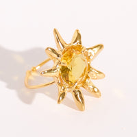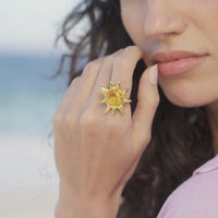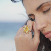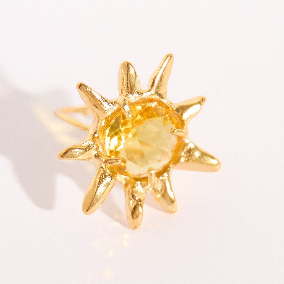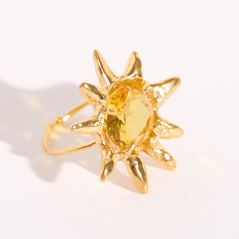 Feito com tecnica de ourivesaria na forma de sol na fundição de bronze com cristal amarelo.