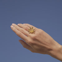 Feito com tecnica de ourivesaria na forma de sol na fundição de bronze com cristal rutilado.