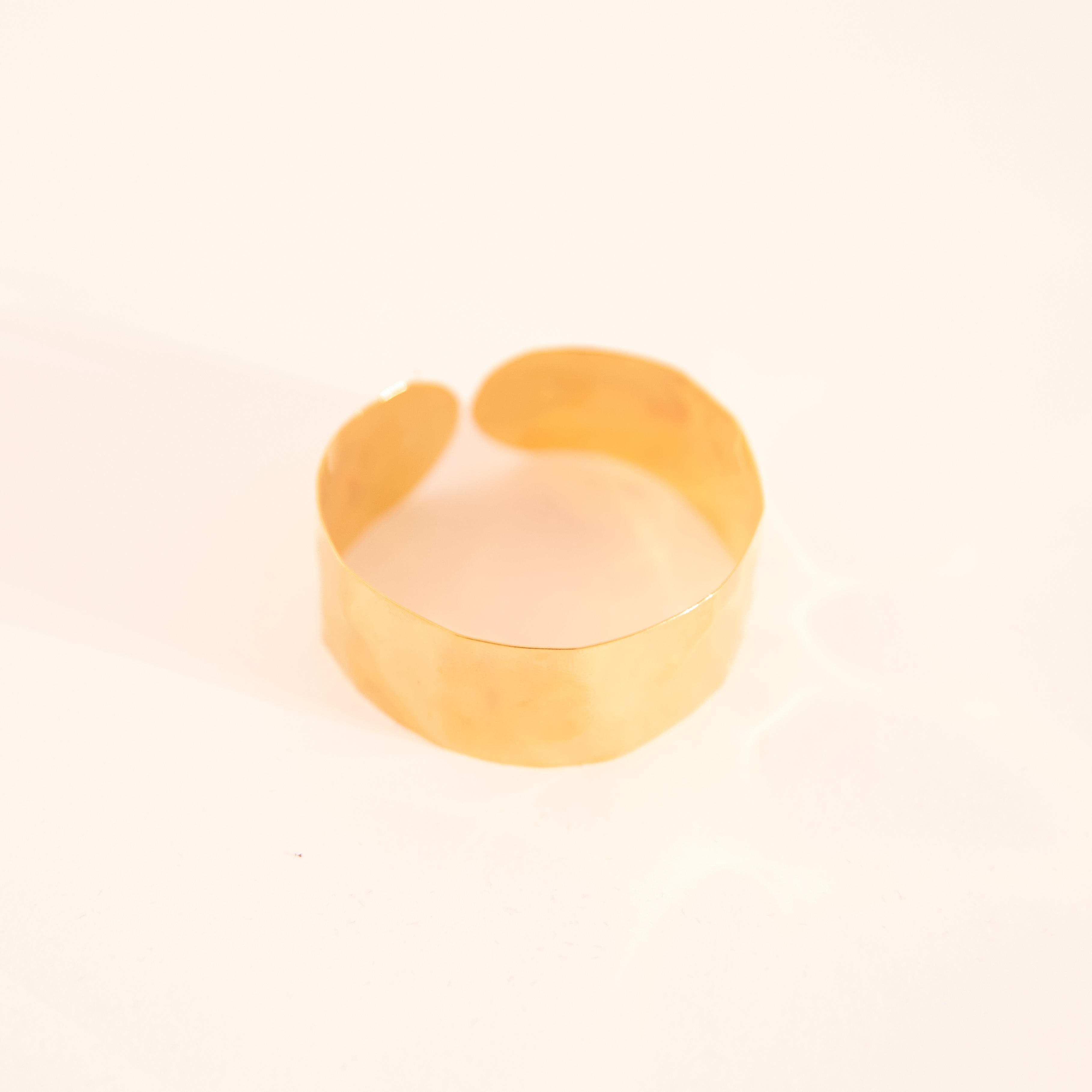 Bracelete feito com fita fina de bronze, com técnica de ourivesaria. Possui abertura e encaixe ao pulso com ajuste manual.
