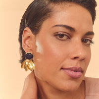 Brinco feito em bronze com técnica de ourivesaria, cravado com cristal azul escuro. Finalizado com banho de ouro 24k.