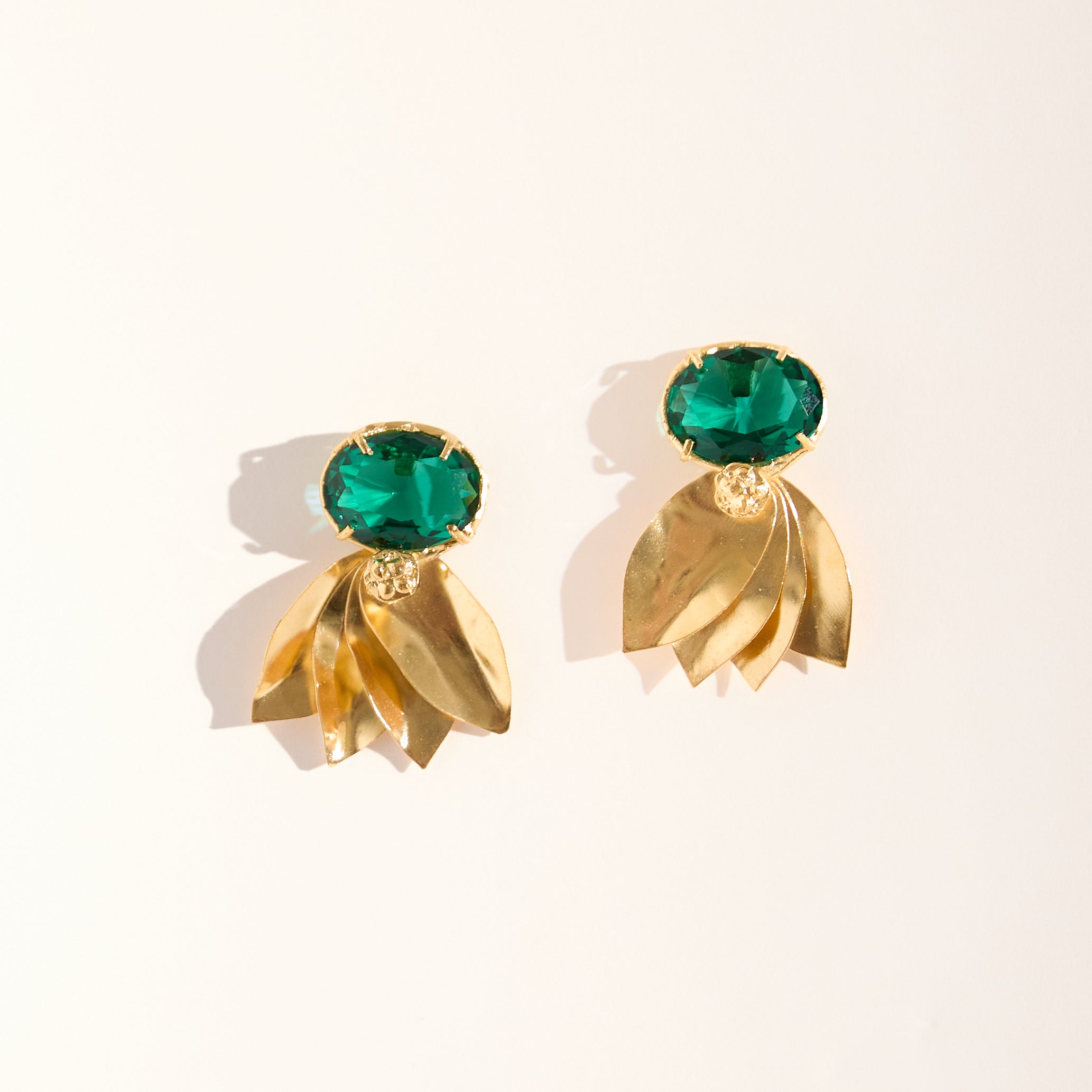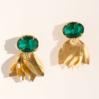 Brinco feito em bronze com técnica de ourivesaria, cravado com cristal verde. Finalizado com banho de ouro 24k.