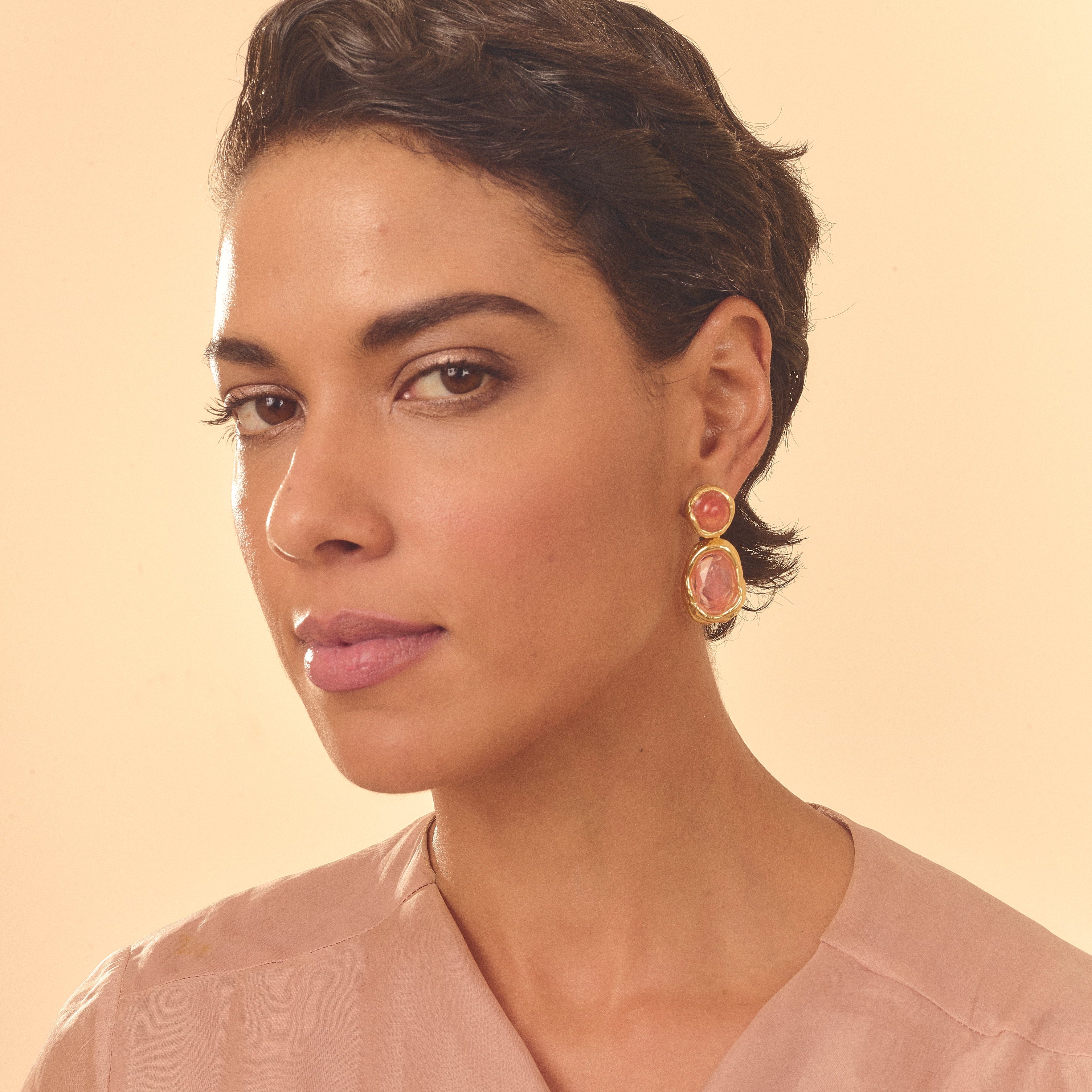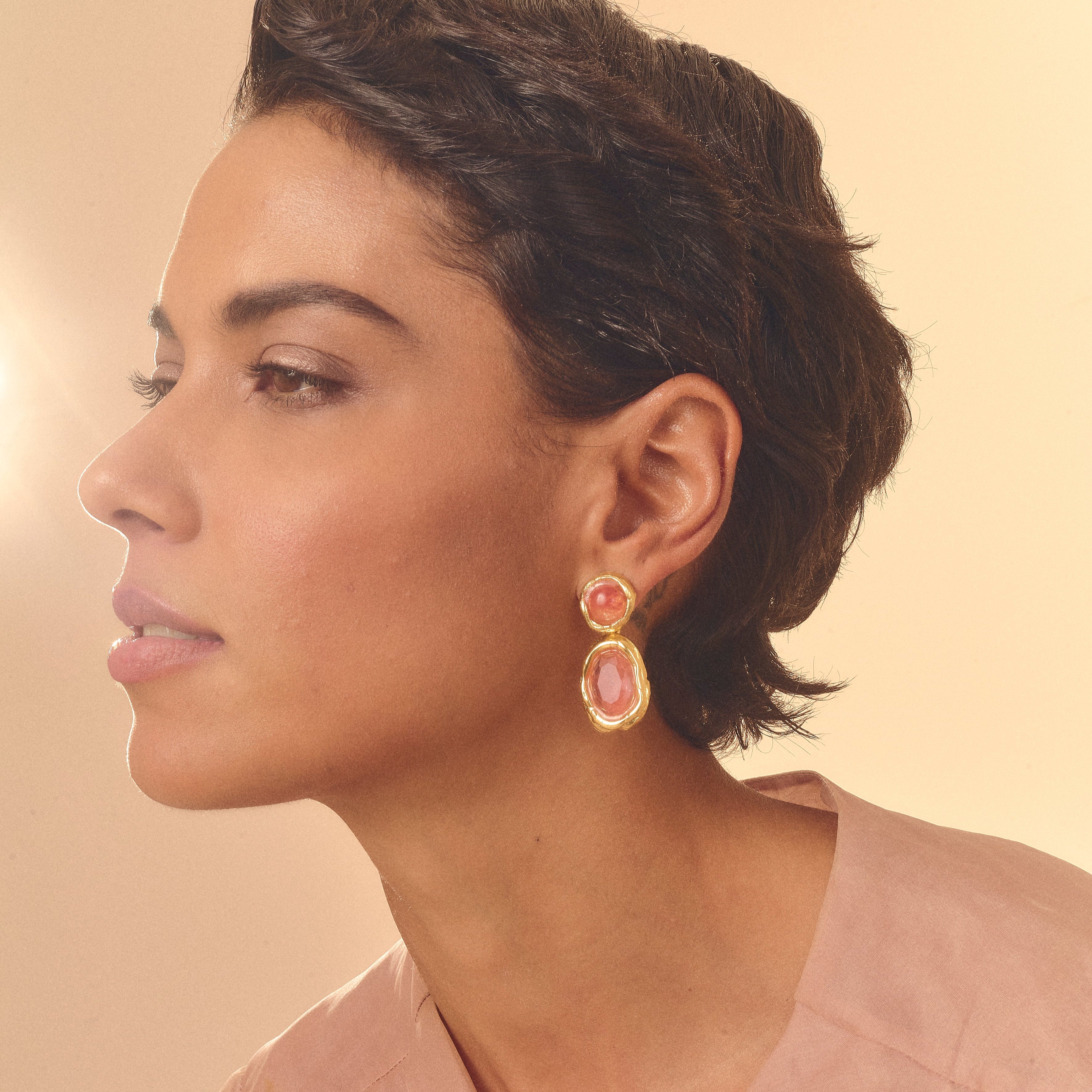 Brinco Espelho Rosé faz parte da coleção Alto Verão Atol. Brinco feito em bronze com técnica de ourivesaria, cravado com cristais rosé. Finalizado com banho de ouro 24k. Tamanho: 2x4,5cmPeso: 12g.