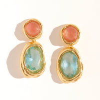 Brinco feito em bronze com técnica de ourivesaria, cravado com cristais rosé e água marinha. Finalizado com banho de ouro 24k.