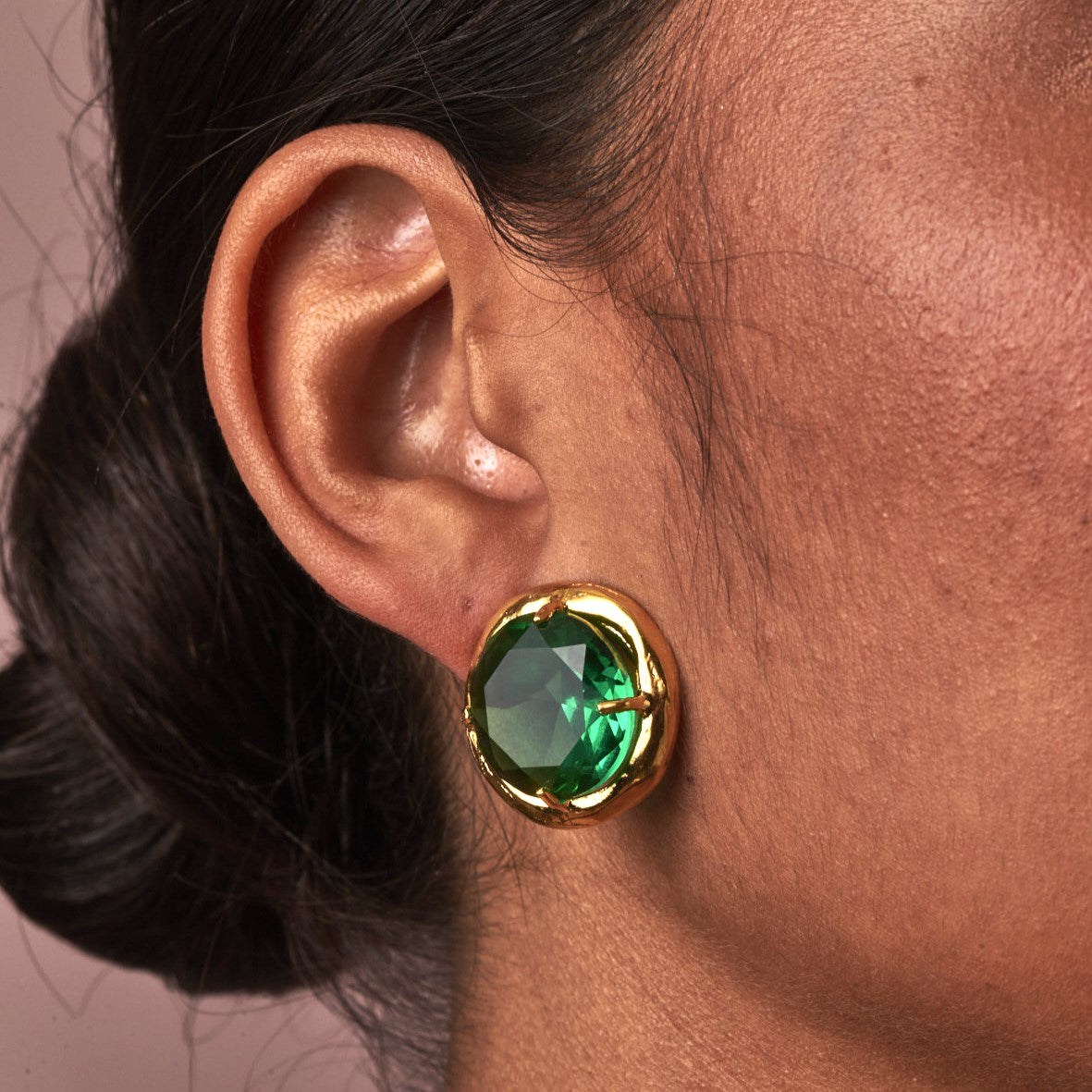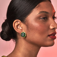 Brinco feito a mão na fundição de latão, finalizado com banho de Ouro 24k , cravado com 1 cristal verde.