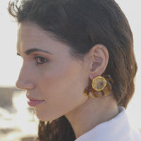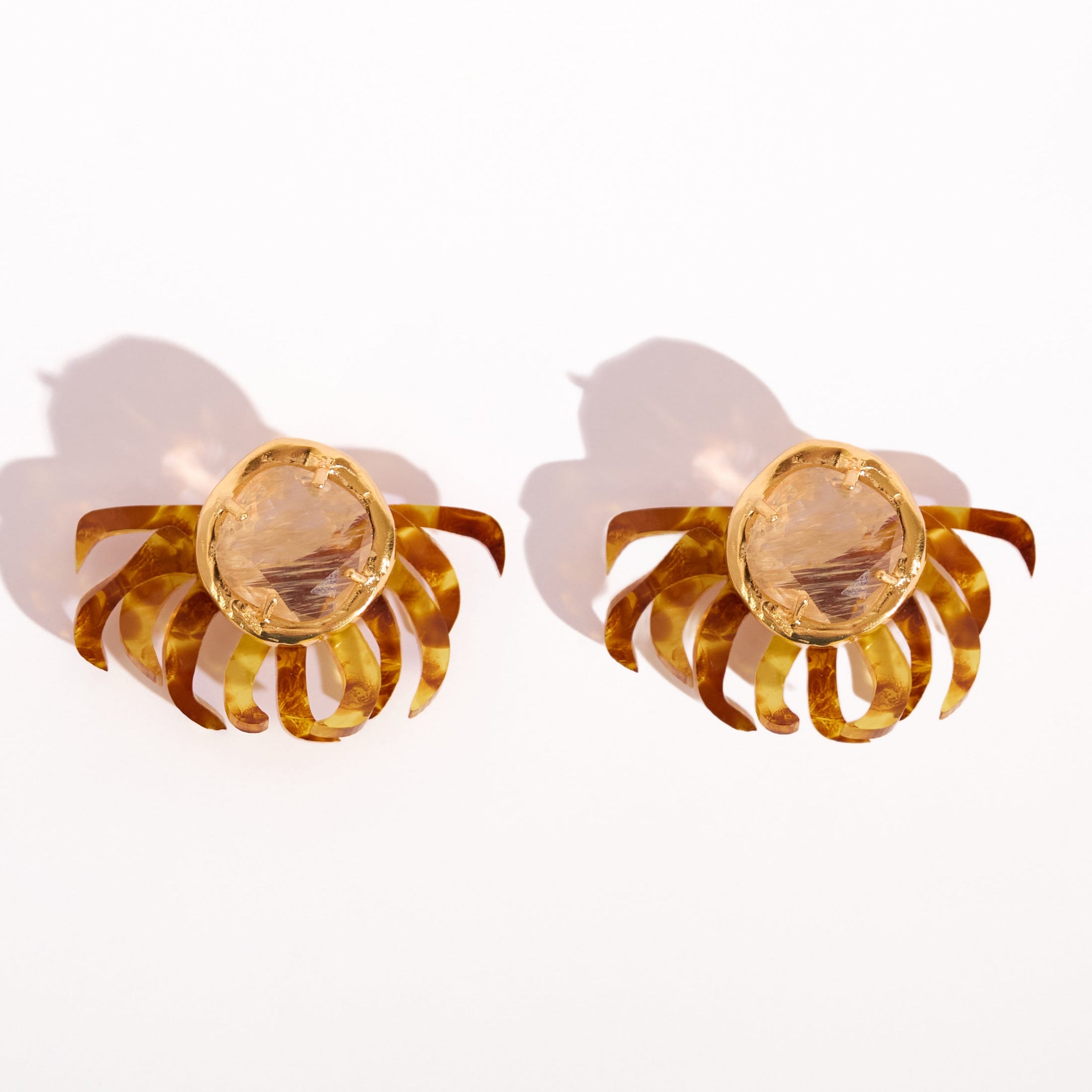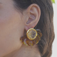 Brinco em acrílico moldado a mão com cristal rutilado. Feito no bronze e finalizado com banho de ouro 24k.