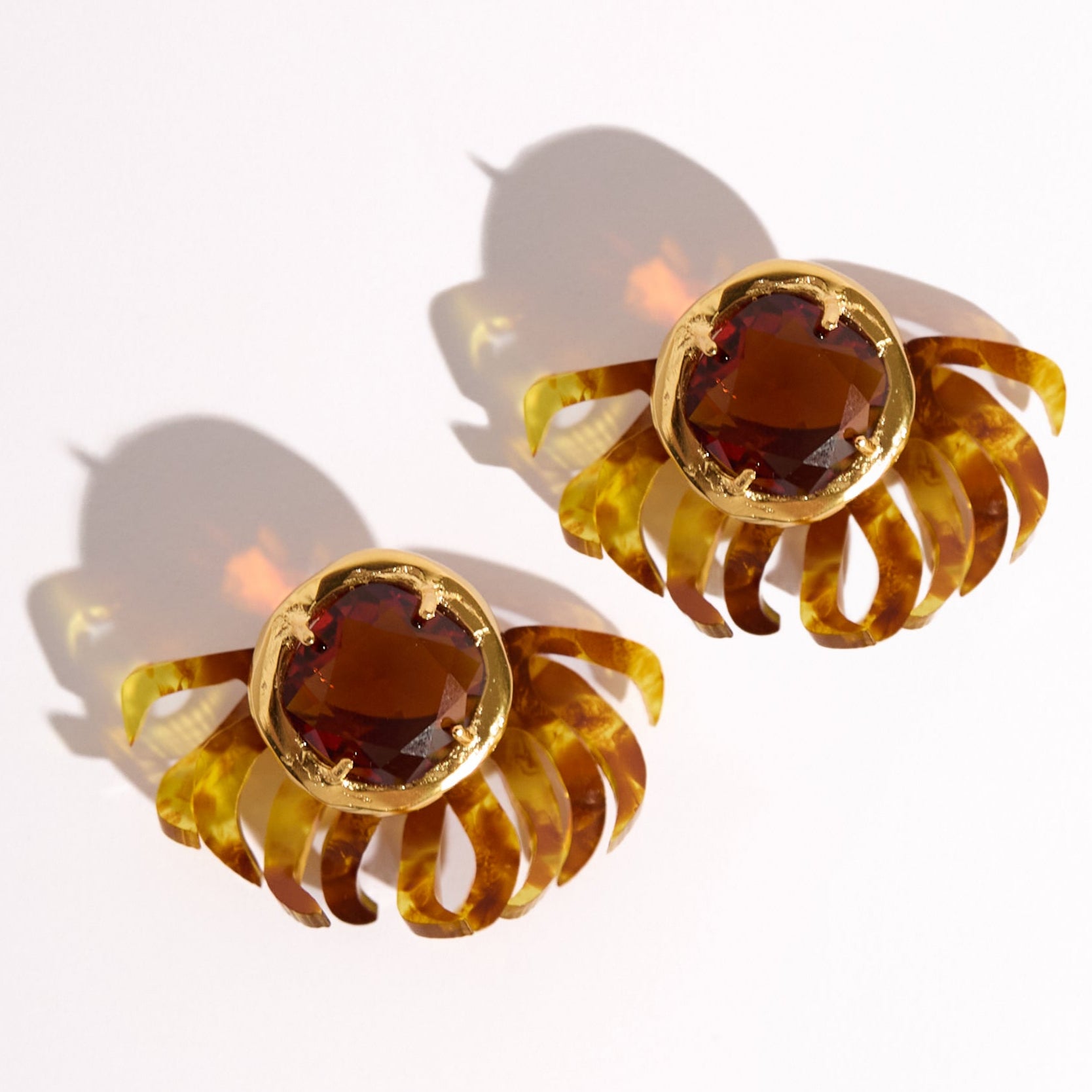 Brinco em acrílico moldado a mão com cristal âmbar. Feito no bronze e finalizado com banho de ouro 24k.