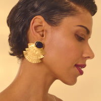 Brinco feito em bronze com técnica de ourivesaria, cravado com cristal azul escuro. Finalizado com banho de ouro 24k.