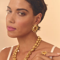 Brinco Solen Amarelo faz parte da coleção Alto Verão Atol. Brinco feito com técnica de ourivesaria, cravado com cristais amarelos. Finalizado com banho de ouro 24k. Peso: 9,4g.