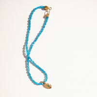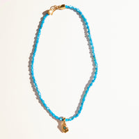 Colar feito com pedras naturais, pingente feito em técnica de ourivesaria e cravado com cristal azul. Finalizado com banho de ouro 24k.