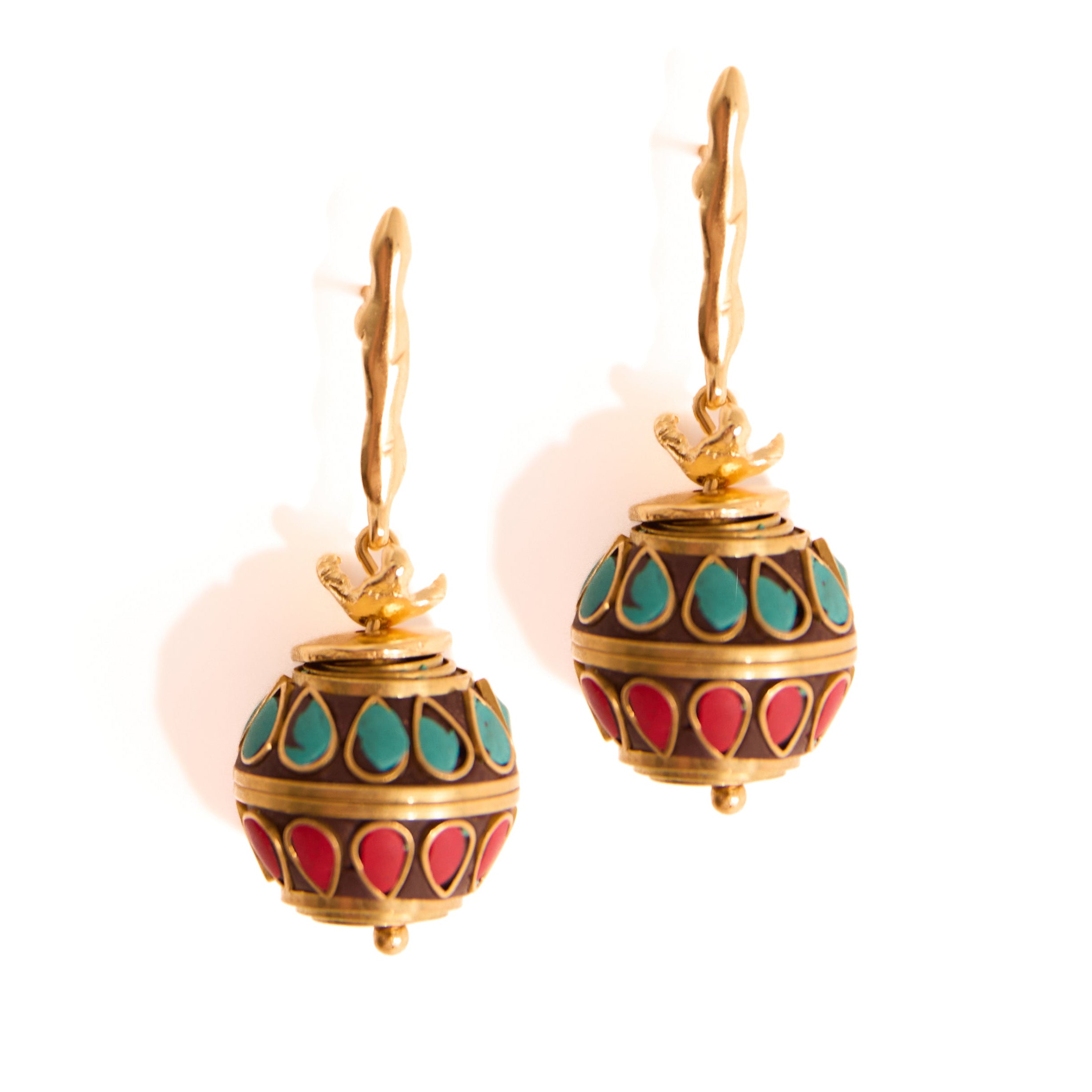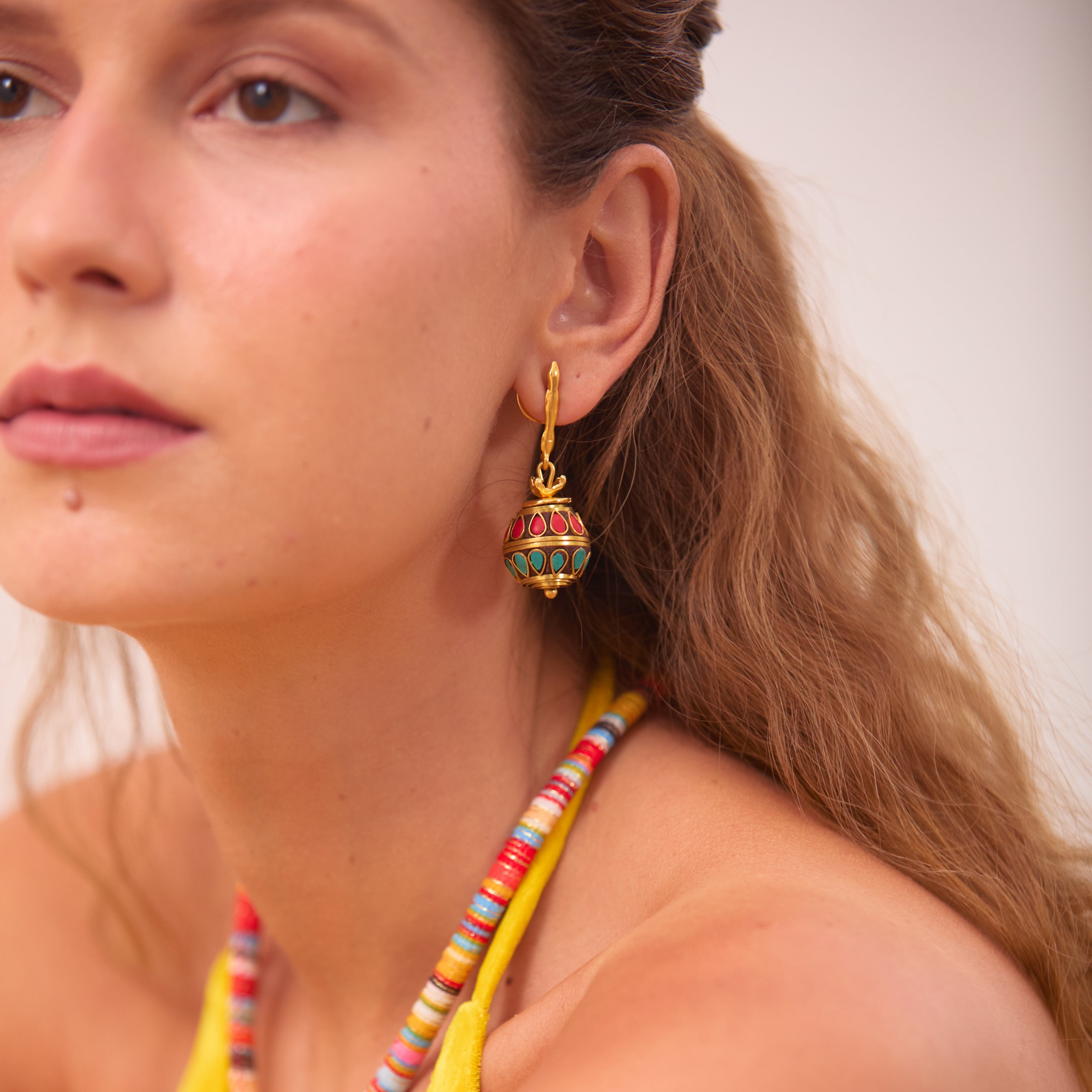 Brinco Nannai faz parte da coleção Atol. Brinco feito com bolas com aplicações orgânicas. Finalizado com banho de ouro 24k. Por serem aplicações orgânicas, podem sofrer leve alteração de cor, mas seguem as mesmas proporções da imagem. Peso: 9g.