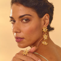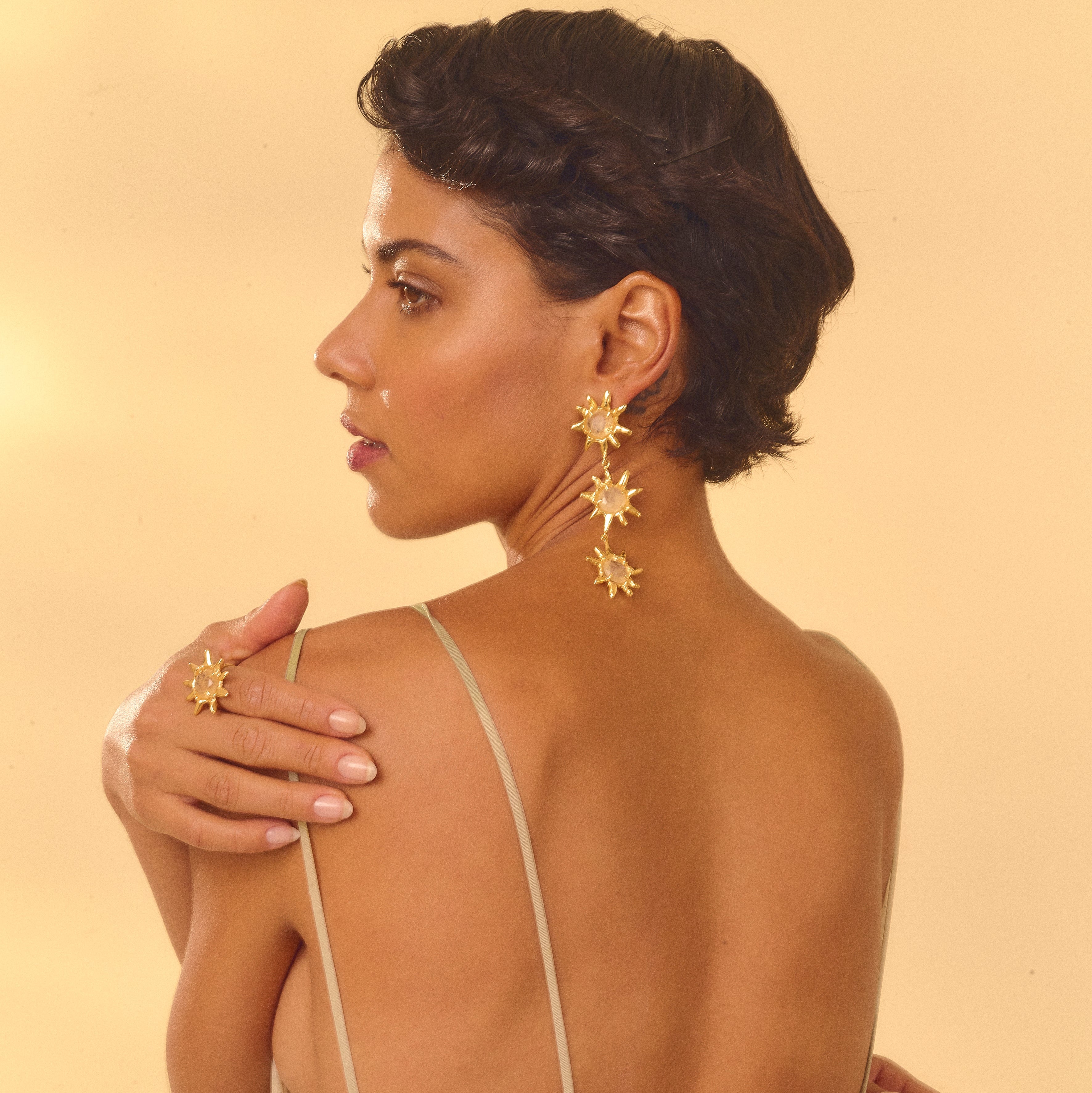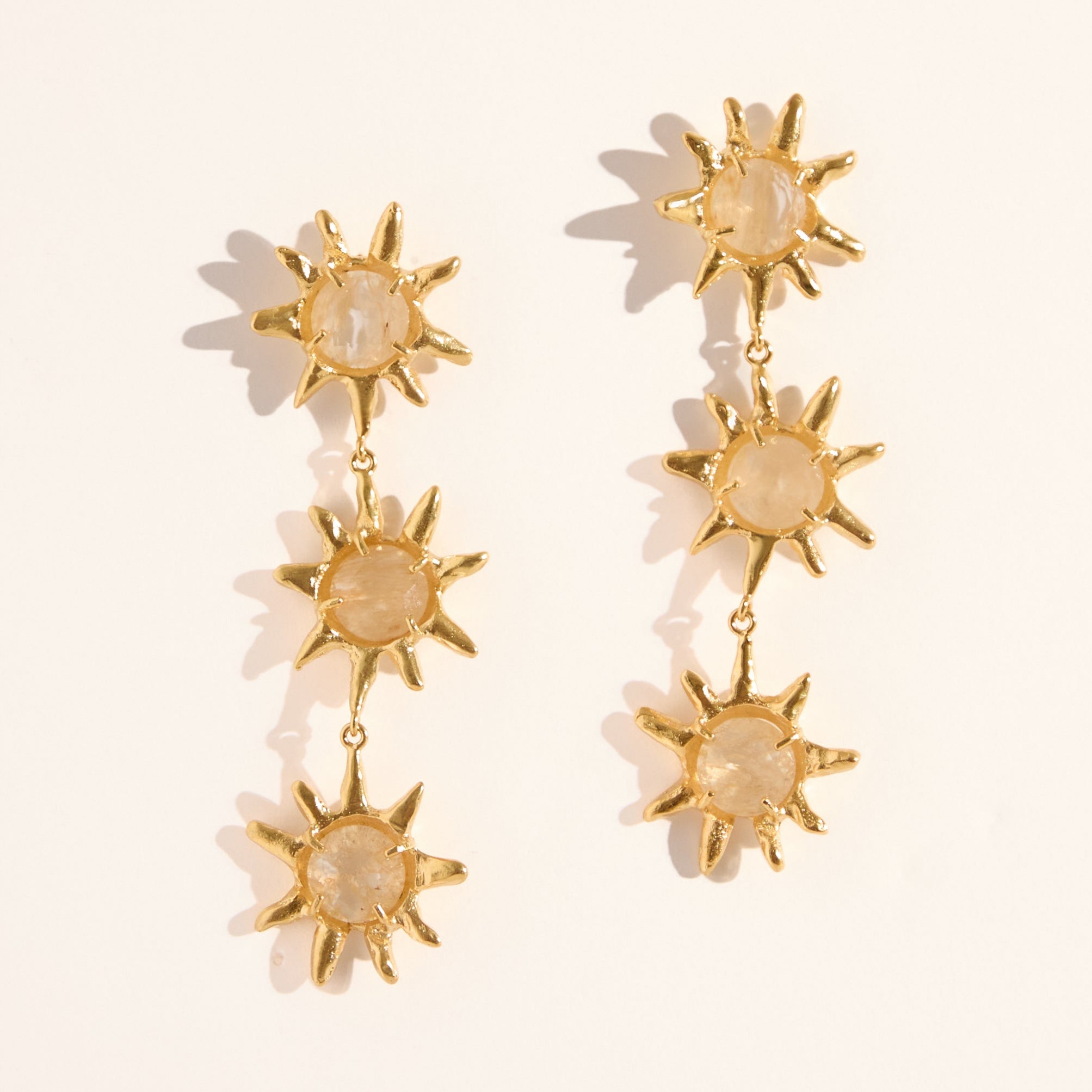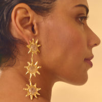 Brinco Kili Three Rutilado faz parte da coleção Alto Verão Atol. Brinco feito em bronze com técnica de ourivesaria, cravado com cristais rutilados. Finalizado com banho de ouro 24k. Peso: 14,6g.