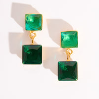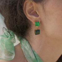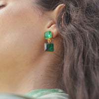 Brinco Rocas Verde esmeralda faz parte da coleção Atol. Brinco feito em bronze, com técnica de ourivesaria e cravado com cristais verdes. Finalizado com banho de ouro 24k. Peso: 4,8g.