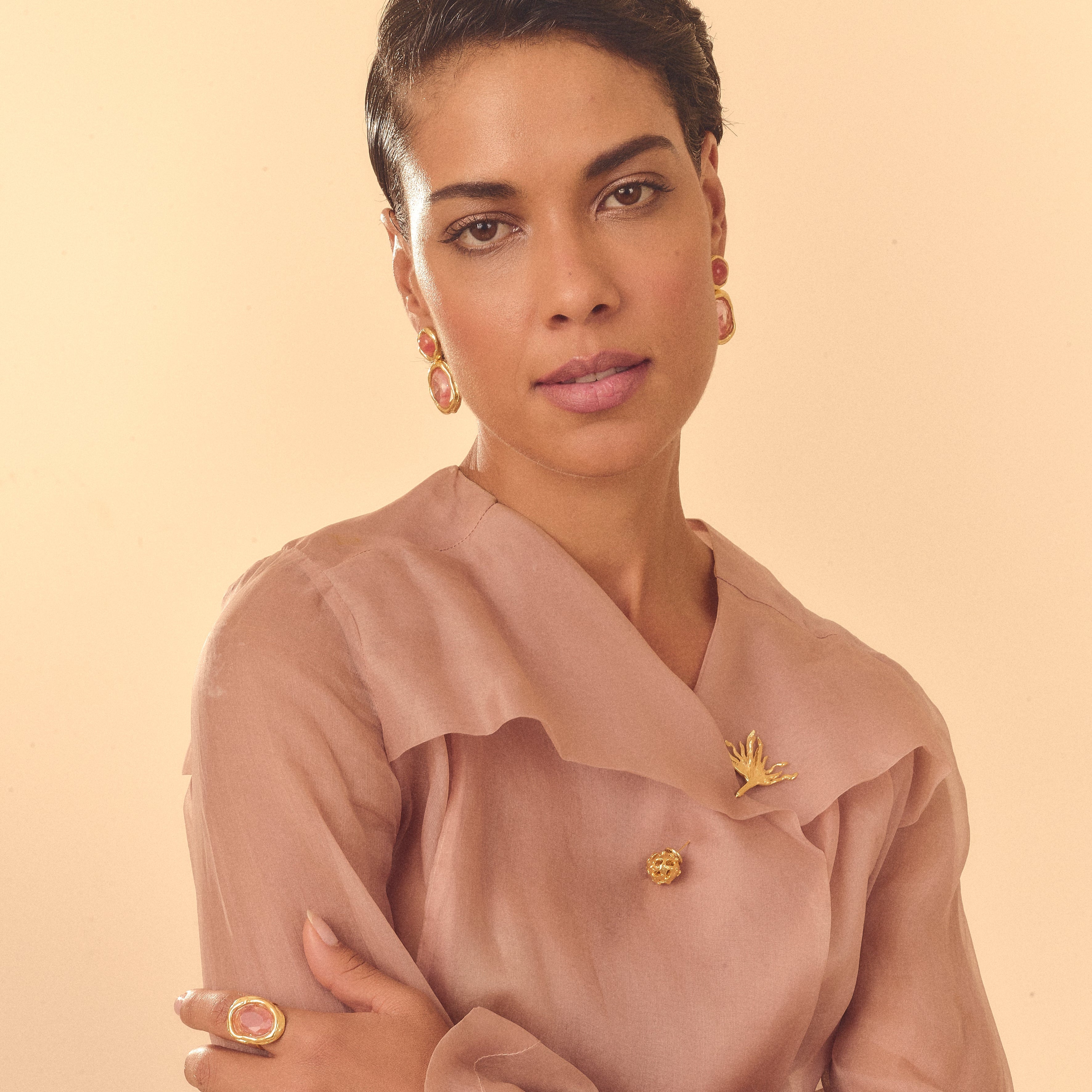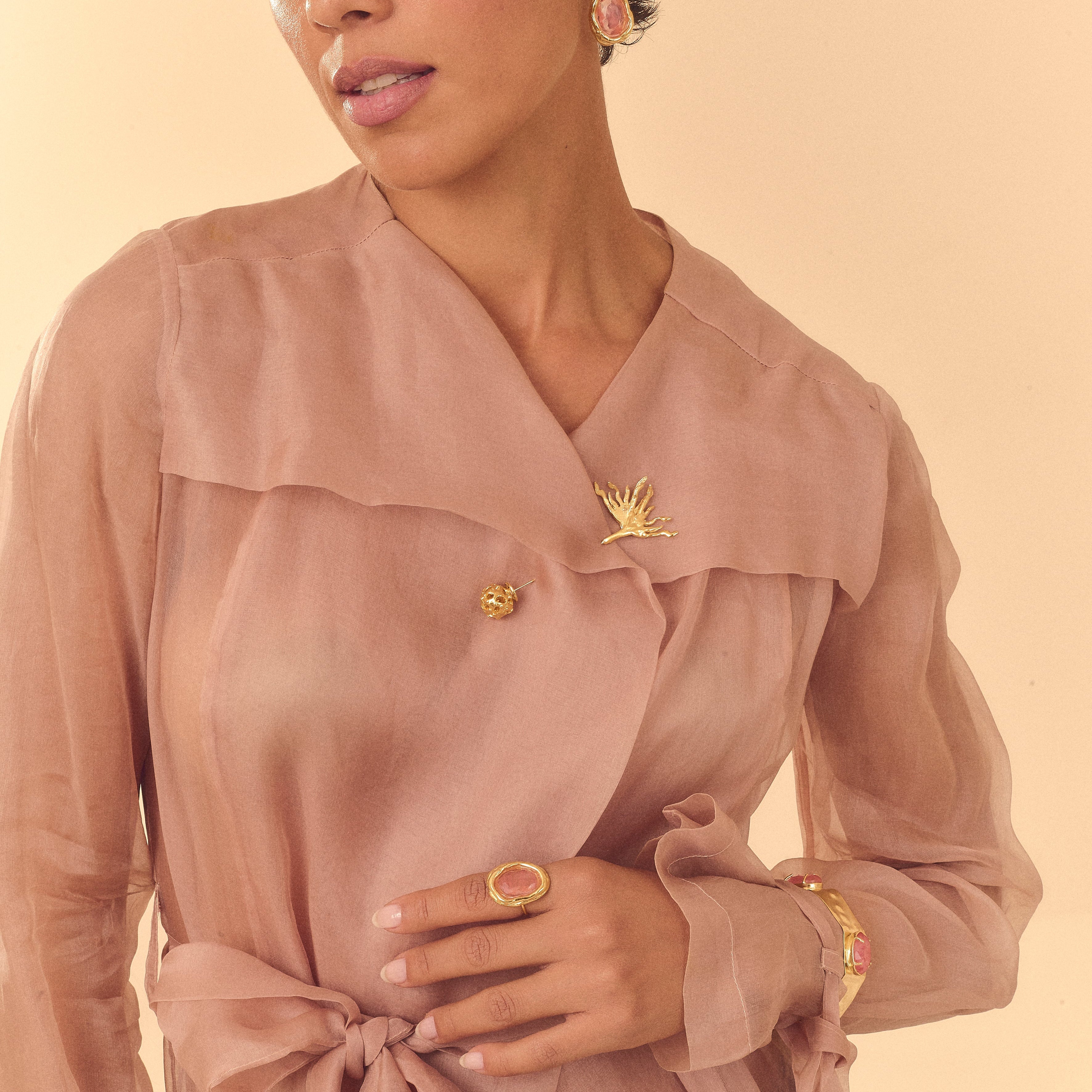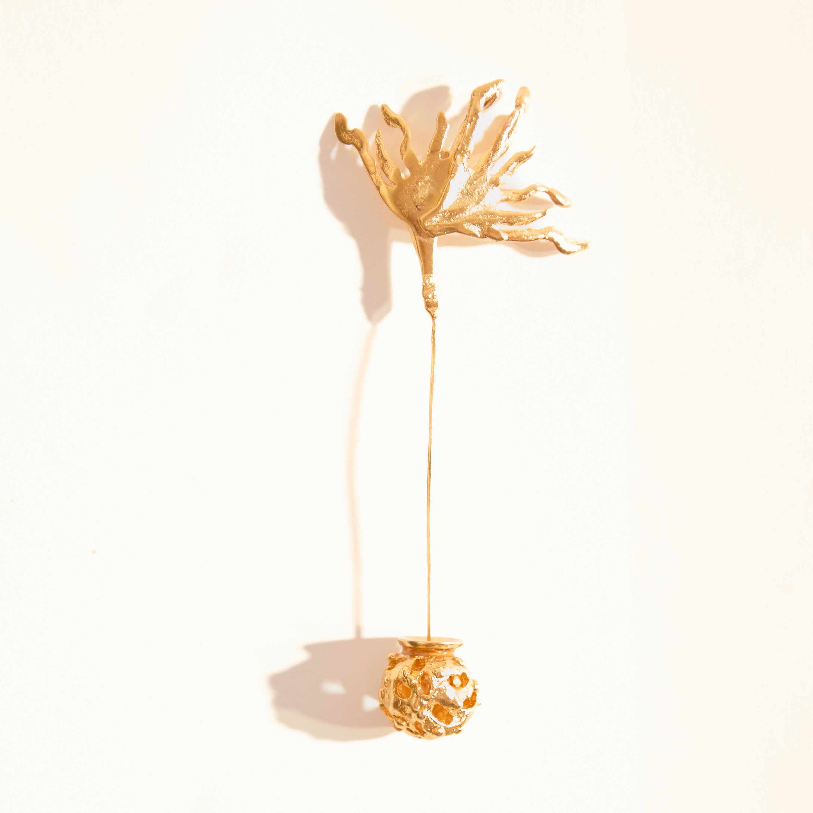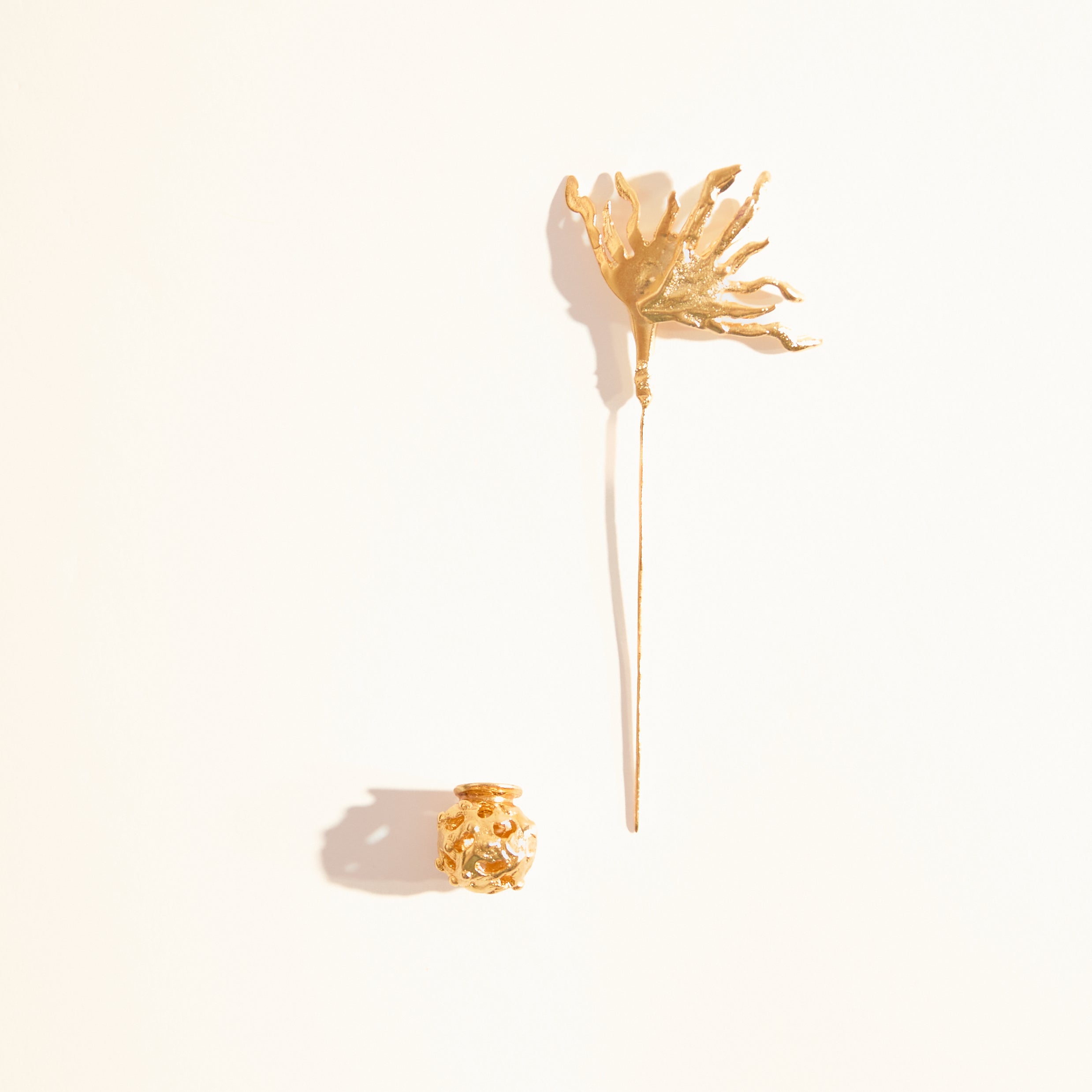 Broche Milagres faz parte da coleção Alto Verão Atol.Broche feito em bronze, estilo alfinete, com técnica de ourivesaria. Finalizado com banho de ouro 24k. Tamanho: 11cm aprox.