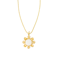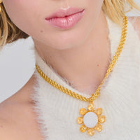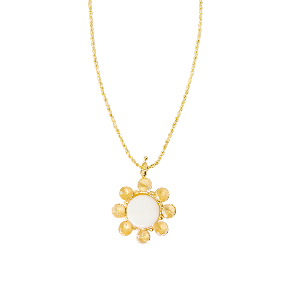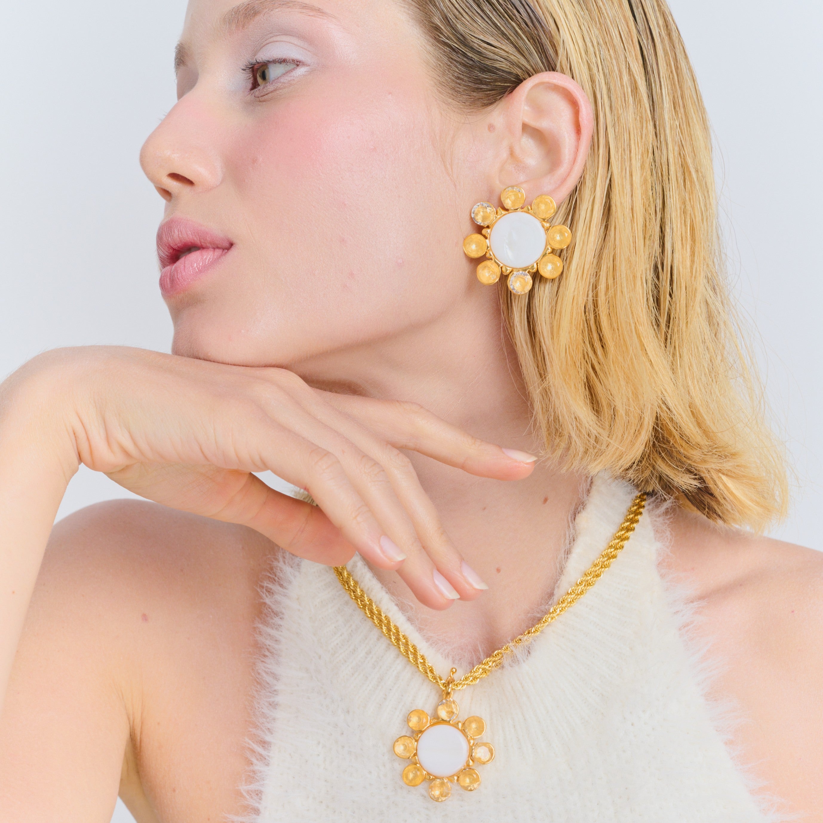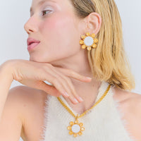 Colar Blomma Madre faz parte da coleção Fractal. Colar feito com técnica de ourivesaria, cravado com pérolas de madre naturais e cristais. Finalizado com banho de ouro 24k. Comprimento: 80cm. Pingente 5cm.
