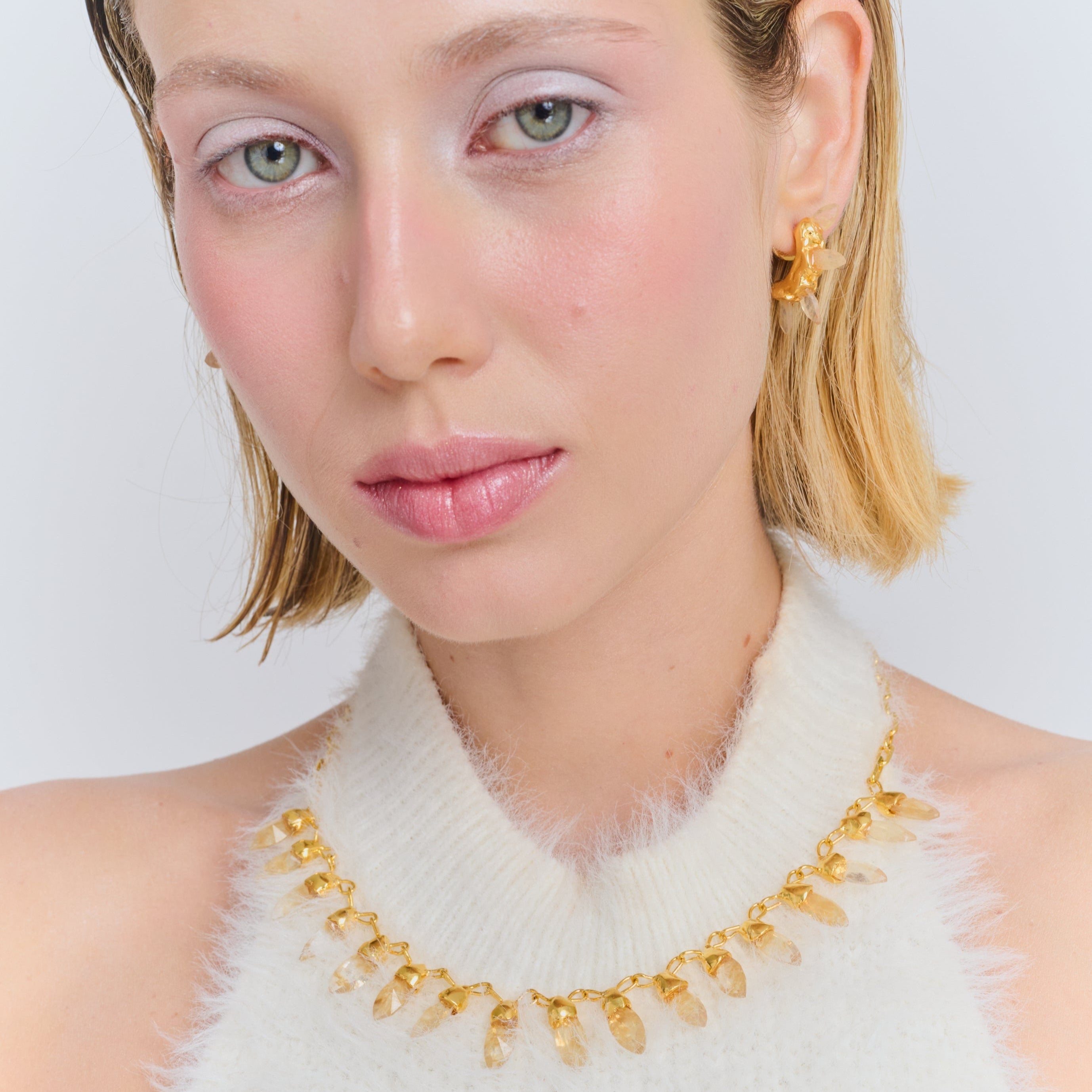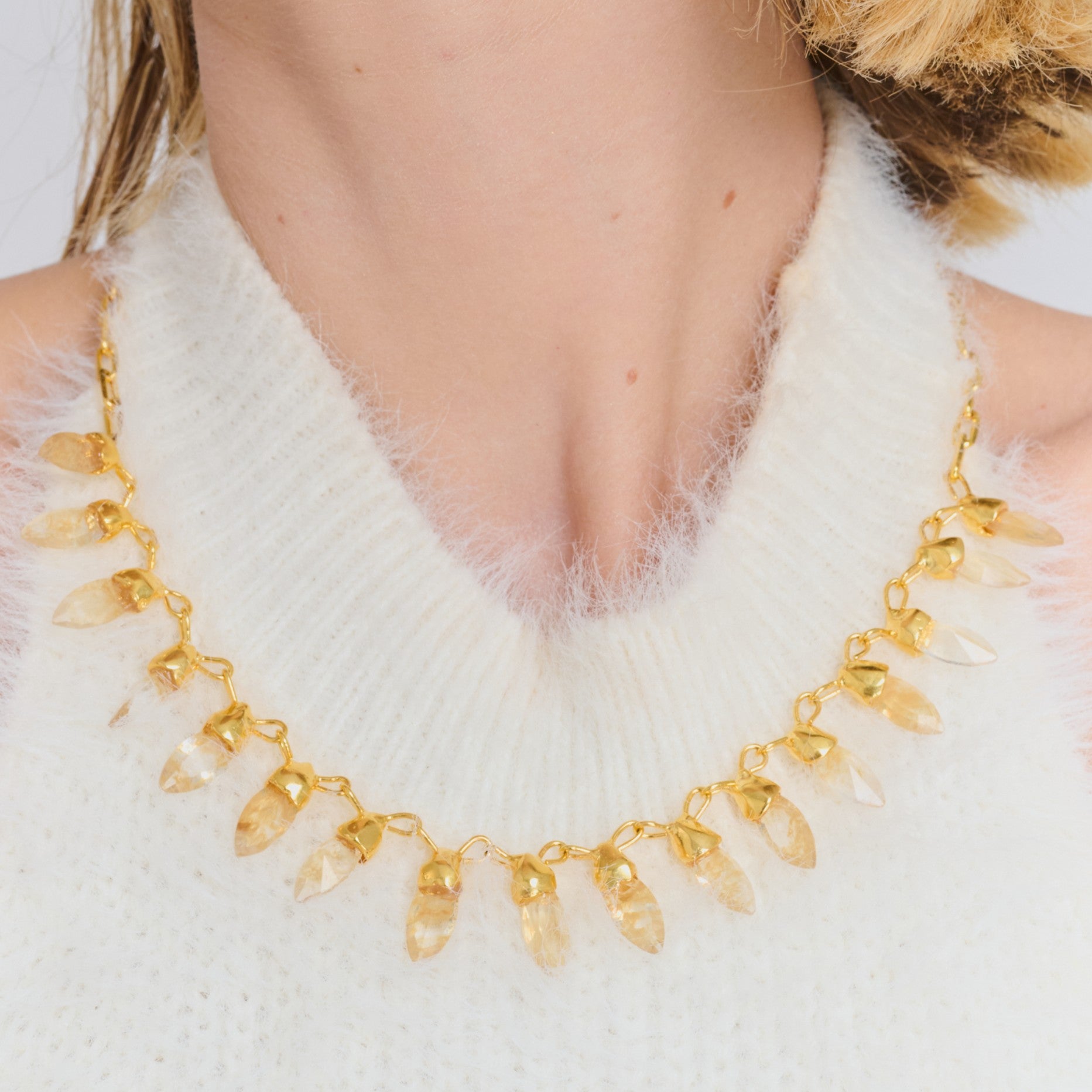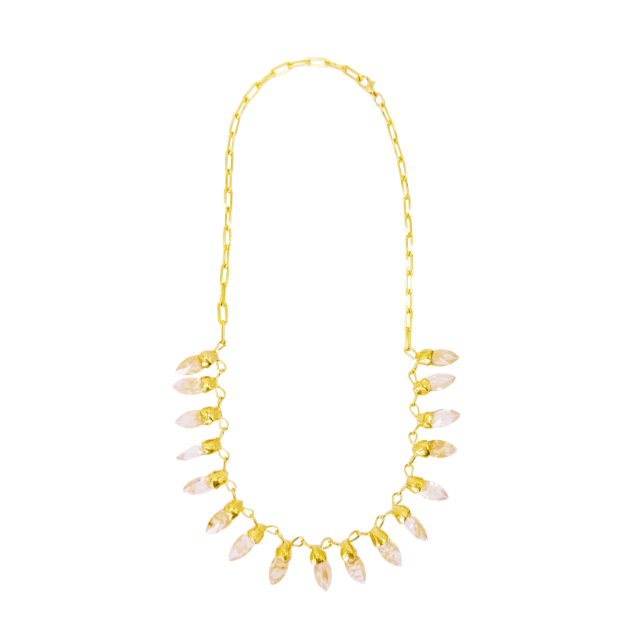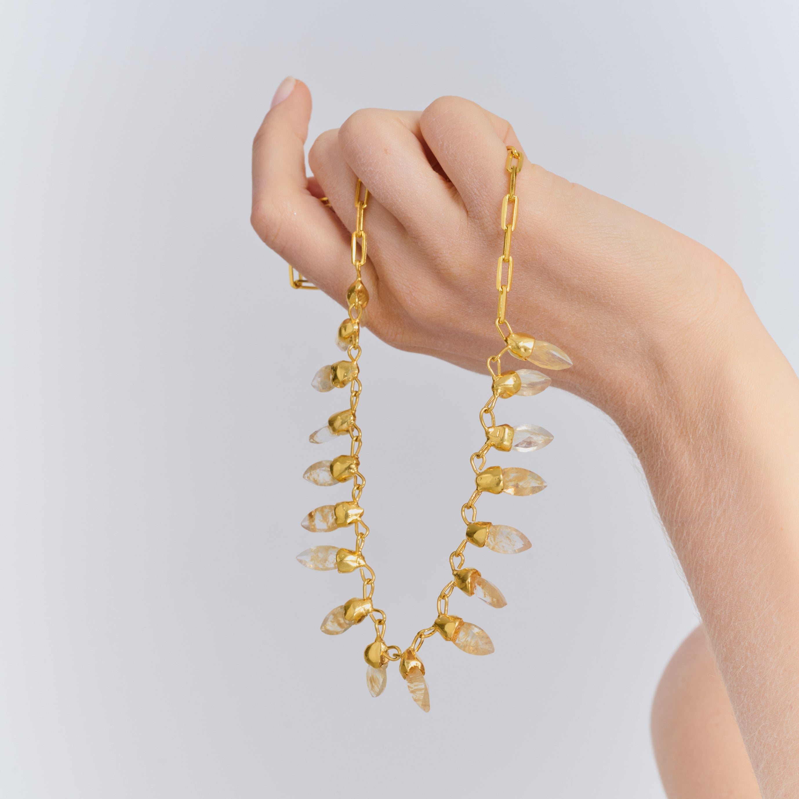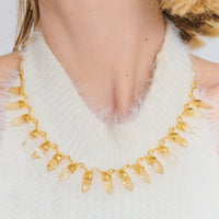 Colar de corrente, cravado com gotas de cristais rutilados. Finalizado com banho de ouro 24k.