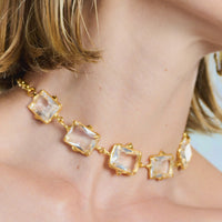 Colar Val Thorens Cristal faz parte da coleção Fractal. Colar de corrente, cravado com cristais rutilados retangulares. Finalizado com banho de ouro 24k. Comprimento: 42cm.